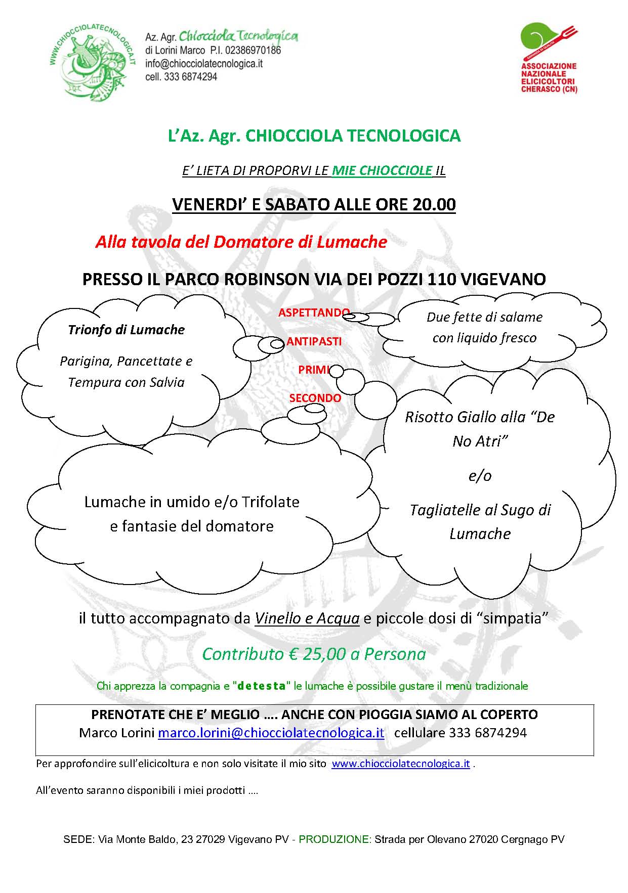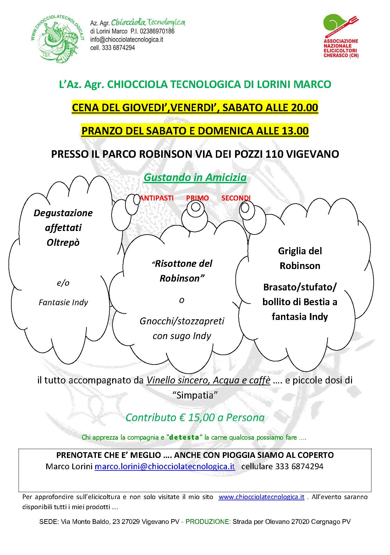 L'affermazione "BISOGNA PROVARCI!" risale all'anno 2005, accumulando la necessaria esperienza si diventa professionisti. Acquisita la qualifica di IAP Imprenditore Agricolo Professionale nel 2010 costituisco l'Azienda Agricola Chiocciola Tecnologica di Lorini Marco da fine 2011 con impegno quotidiano sono disponibili in quantità sempre più importanti delle semplici lumache. No!! Quelle Buone... Oggi giugno 2018 possiamo dire "CI SIAMO RIUSCITI" Portare in tavola un buon piatto a base di lumaca o di lumache nei tempi passati era un momento di festa. Oggi molte tradizioni sono disperse nel dinamismo moderno, accettarlo non è facile e adeguarsi diventa necessità, io insieme a molti altri tentiamo di mantenere o riproporre i sapori che la globalizzazione tende a cancellare.Tre anni orsono ho preso in gestione il Parco Robinson area PIC-NIC attrezzata e ho realizzato il Punto vendita Integrato "LA SOSTERIA" che oltre le mie lumache si trovano anche altri prodotti Agricoli e Non e soprattutto si possono gustare direttamente. COME E DOVE TROVARMI ?AL PARCO ROBINSON DI VIGEVANO per sicurezza chiama il 3336874294 Sempre disponibili i prodotti nel "E-shop" on line: Cena e Pranzo Robinson € 15.00 fino al CaffèCena Lumache € 25.00 fino al CaffèPrenotare al 3336874294 è meglio per tutti